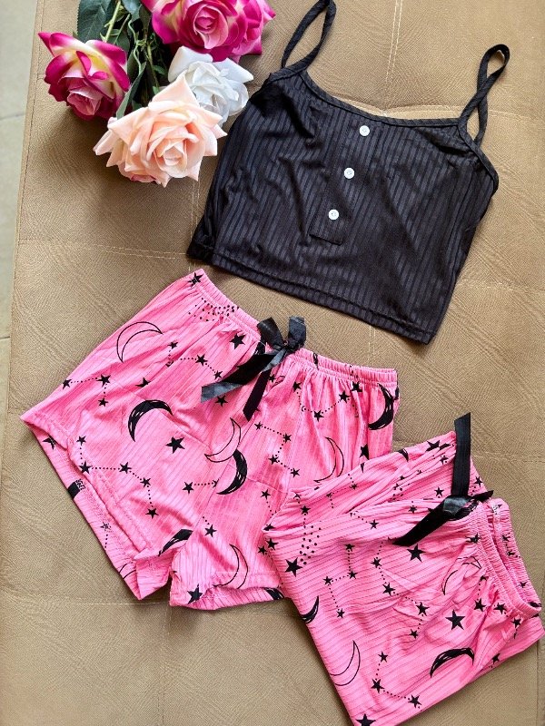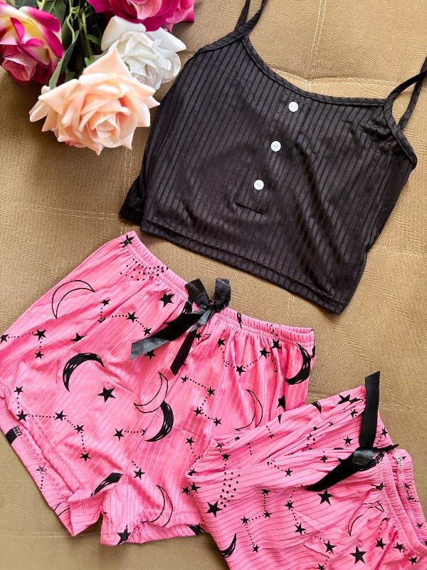♥ Pijama con musculosa mas corta con botones, viene 3 piezas: Short y pantalón.
